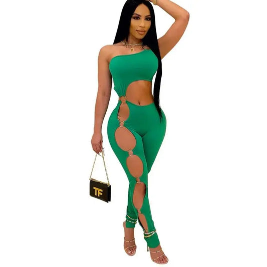Sexy Women Outfit Hollow Out Jumpsuit Sleeveless One Shoulder Rompers Holes