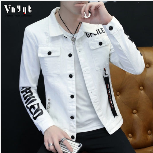 Fashion Hip Hop White Denim Jacket Male Cowboy Ripped Hole Denim Jacket