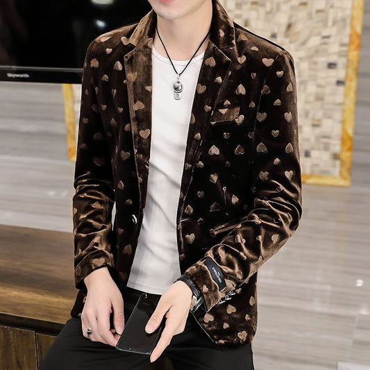 Men New Four Seasons Heart-Shaped Jacquard blazer Gold Velvet Casual Slim Handsome